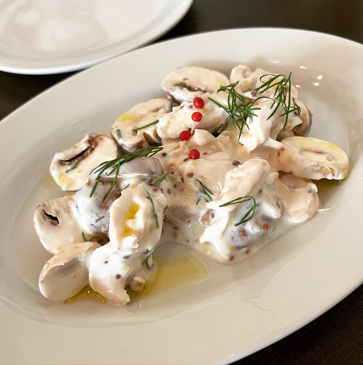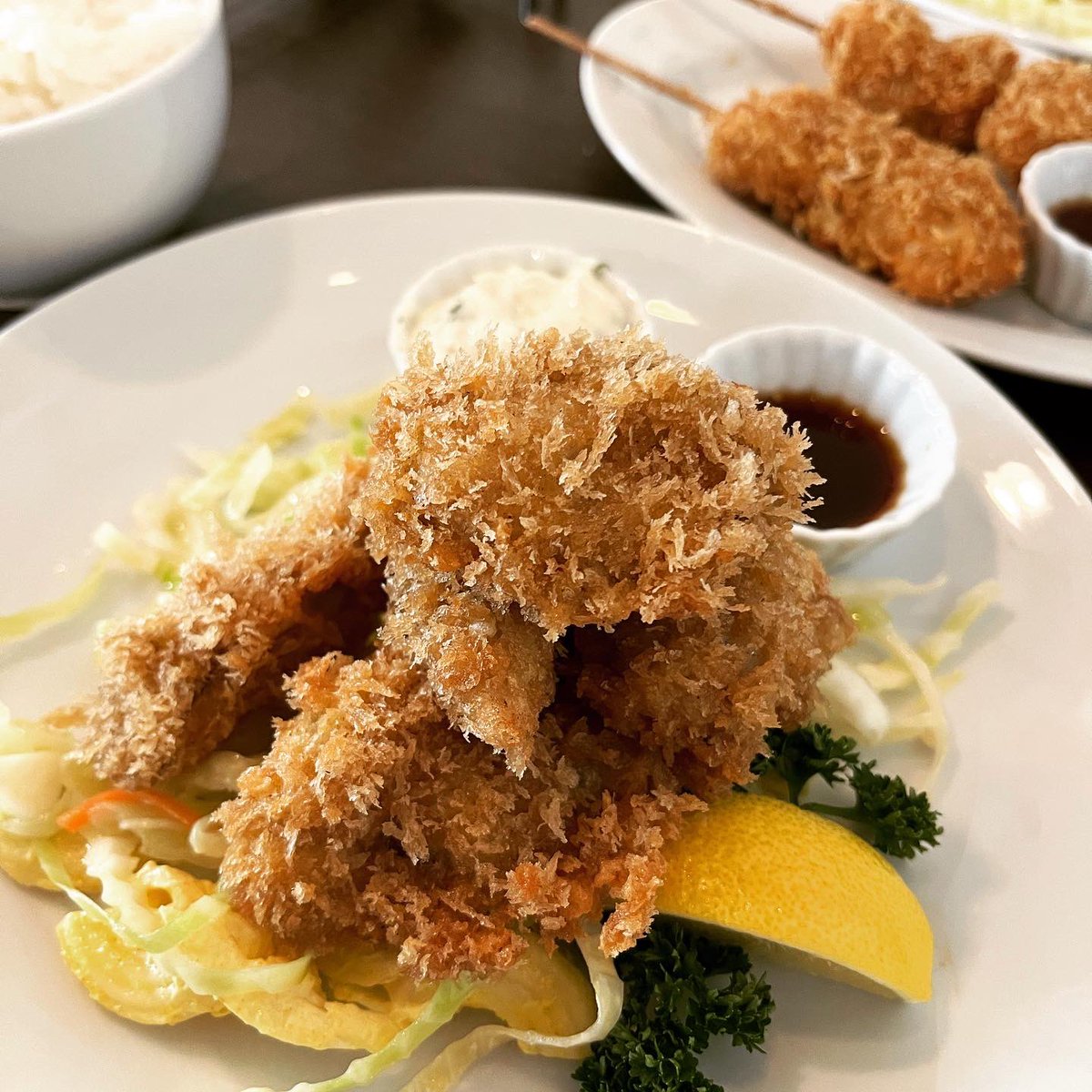 町田の航旅莉屋でランチ。 「鶏肉とマッシュルームのサラダ」 「お肉の前菜盛り合わせ」 「お野菜のポタージュ」 「カキフライ」 今シーズンのラストカキフライ。 タルタルも良いけど、ニンニク酢醤油が好き( ̄▽ ̄)