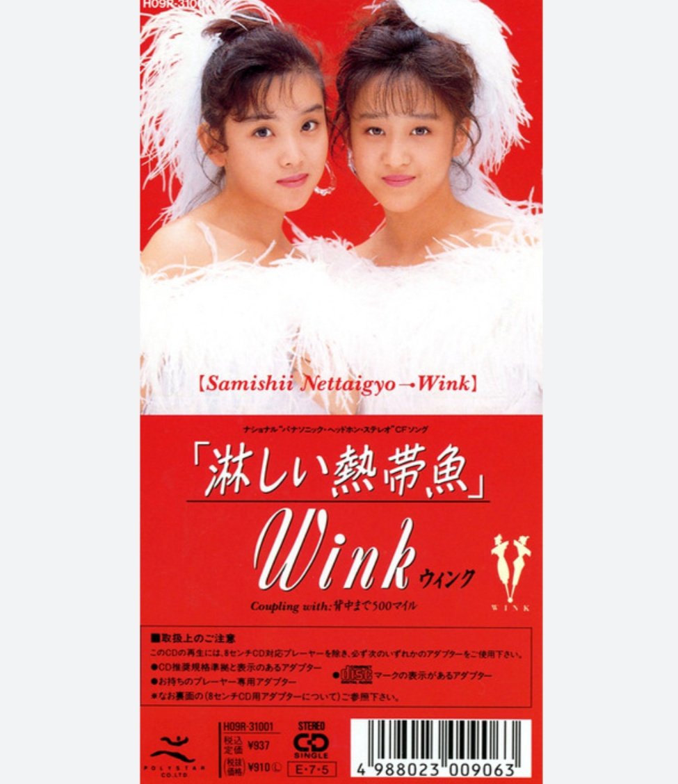 1203.淋しい熱帯魚 1989年ポリスターより発売されたWinkの5枚目のシングルでチャート最高位は1位(週間 1989年度年間7位)です。オリジナル楽曲としては彼女達の最大のヒット曲であり第22回全日本有線放送大賞 第31回日本レコード大賞など各賞を受賞し本楽曲で第40回NHK紅白歌合戦に初出場を果たしました